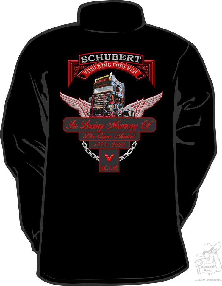 Schwarze AST "Memory Edition" Fan Jacke mit Truck-Motiv, Flügeln und "Schubert Trucking Forever" Aufschrift.
