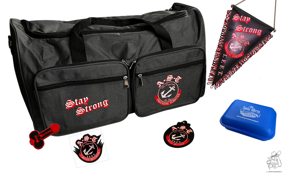 Fanpaket mit grauer Stay Strong Tasche, rotem Lufterfrischer, blauem Berg Brotzeitdose, schwarzem AST Wimpel, Einkaufs-Chip und AST Aufkleber.