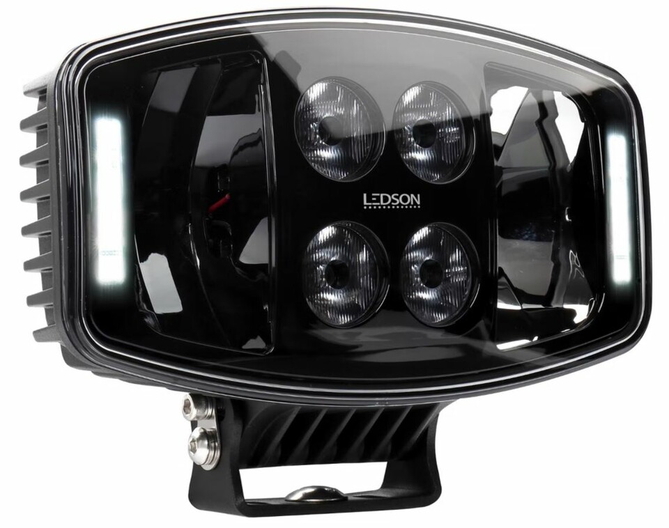 Schwarzer Ledson LED Zusatzscheinwerfer mit klarem Glas, leuchtenden weißen Positionslichtern und Kühlrippen.