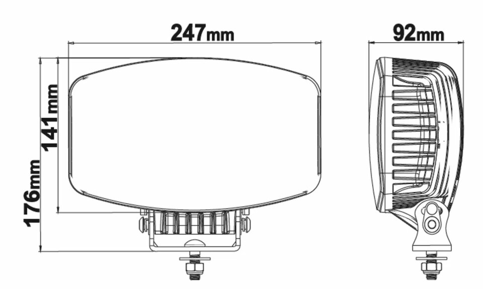 Maßzeichnung des Ledson LED Zusatzscheinwerfers Libra10+ von vorne und Seite.