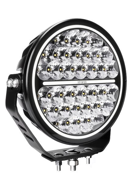 Runder Fernscheinwerfer mit schwarzem Aluminiumgehäuse, klarer Polycarbonatlinse, mehreren weißen LEDs, beleuchtetem Ring und 'strands' Schriftzug.