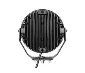 Rückseite eines schwarzen runden Fernscheinwerfers mit Kühlrippen und schwarzer Halterung.