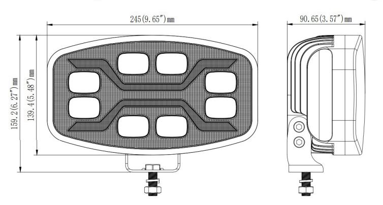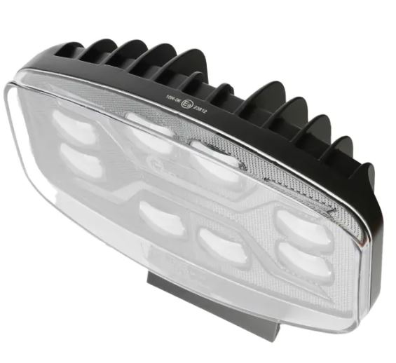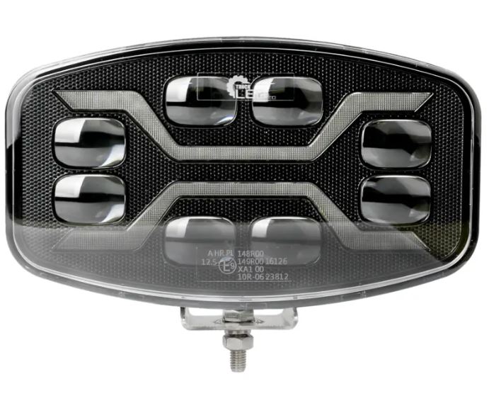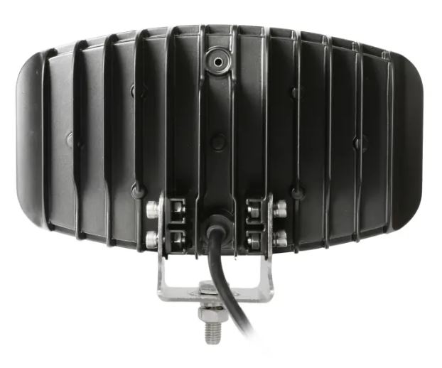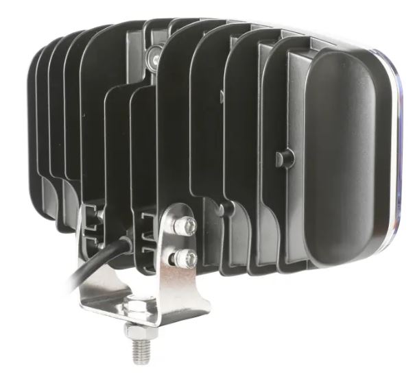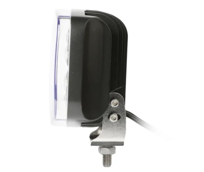 Seitenansicht eines schwarzen LED Fernscheinwerfers mit klarer Polycarbonat-Linse und silberner Montagehalterung.