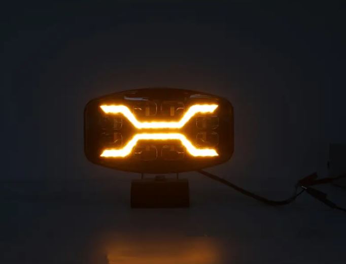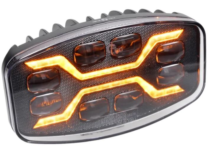 LED Fernscheinwerfer X SPIDER mit leuchtendem orangefarbenem Warnlicht und schwarzem Aluminiumgehäuse.