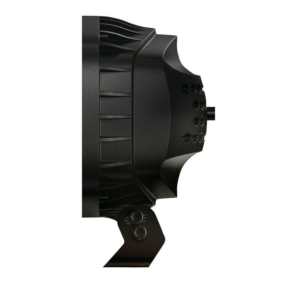 Rückseite des schwarzen ovalen LED Fernscheinwerfers PILOT Glare Oval-Pro aus Aluminium mit Halterung und Kabel.
