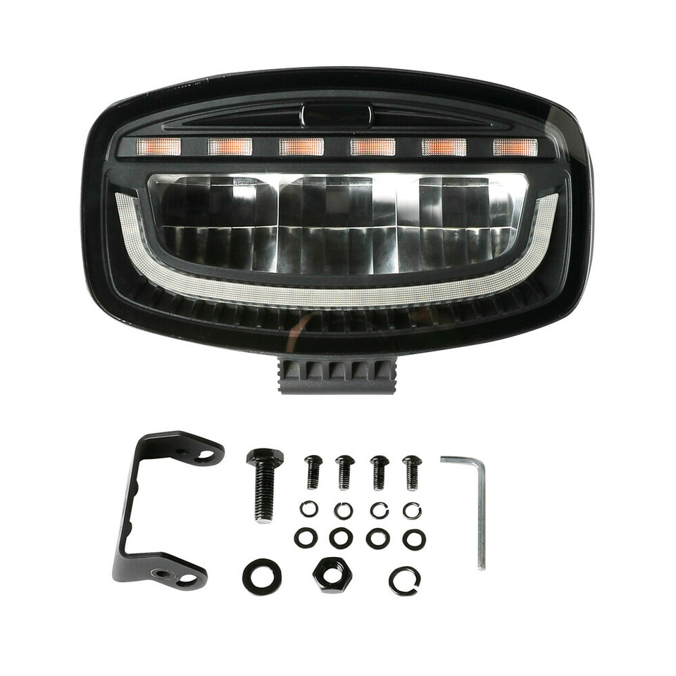 Schwarzer LED Fernscheinwerfer PILOT Glare Oval-Pro mit weißem Positionslicht und orangefarbenen Warnleuchten, inkl. Montagesatz.