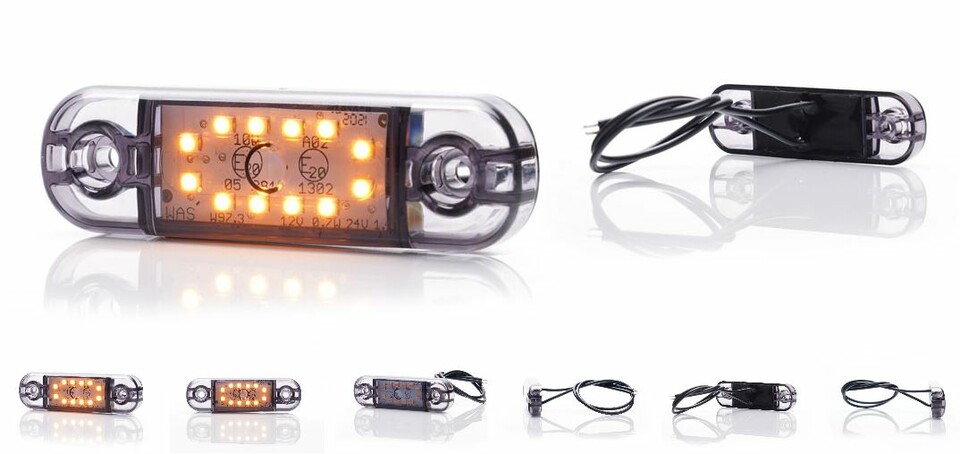 Rauchgraue LED Positionsleuchte mit leuchtenden, bernsteinfarbenen LEDs und Kabeln, mehrfach dargestellt.