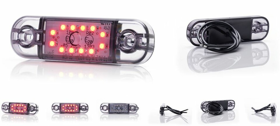 Ovale, dunkle LED Positionsleuchte mit leuchtenden roten LEDs in verschiedenen Ansichten.