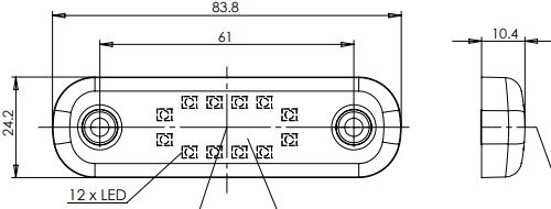 Technische Zeichnung einer superdünnen LED Positionsleuchte. Zeigt Draufsicht mit LEDs und Seitenansicht mit Tiefe.