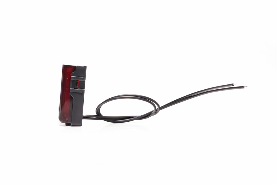 Eine L-förmige, dunkelrote Markierungsleuchte mit schwarzen Anschlusskabeln auf weißem Hintergrund.