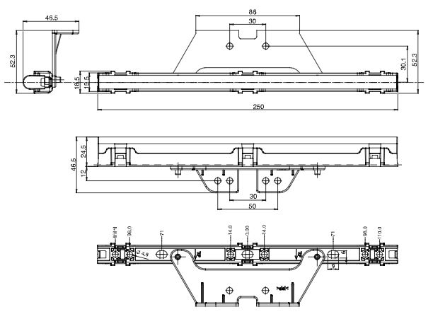Technische Zeichnung einer schwarzen 250mm Markierungsleiste mit Halterungen aus verschiedenen Ansichten.