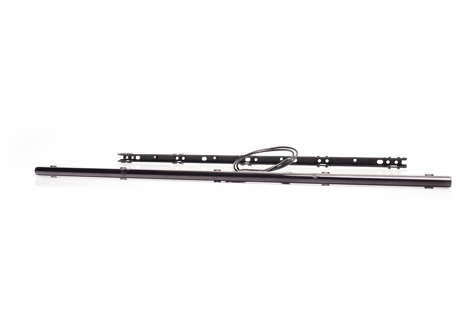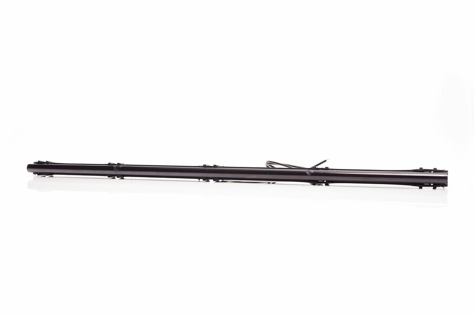 Schwarze Markierungsleiste mit Neon Optik, Montageschiene und Kabel auf weißem Hintergrund.