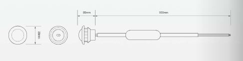 Technische Zeichnung der runden LED Markierungsleuchte mit Kabel und Widerstand, inklusive Maßen.