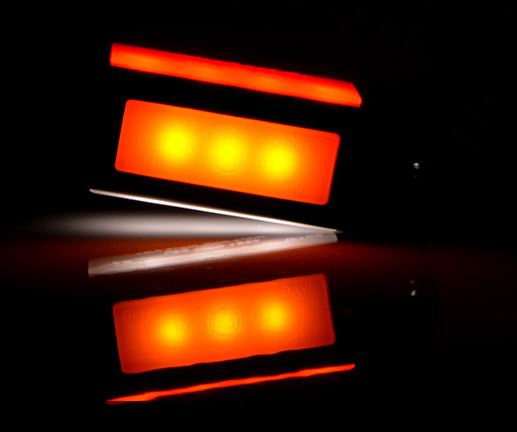 Schwarze LED-Markierungsleuchte mit orangefarbenen und roten Leuchtflächen.