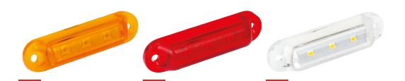Kompakte LED-Begrenzungsleuchten aus Kunststoff in Bernstein, Rot und Klar.