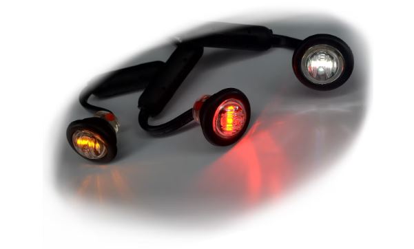 Runde Ledson Markierungsleuchten mit getönten Linsen und schwarzen Gummiringen, leuchtend in Amber, Rot und Weiß.