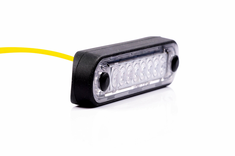 Rechteckige, schwarze LED-Begrenzungsleuchte mit klarer Linse, sichtbaren LEDs, Montageschrauben und gelbem Kabel.