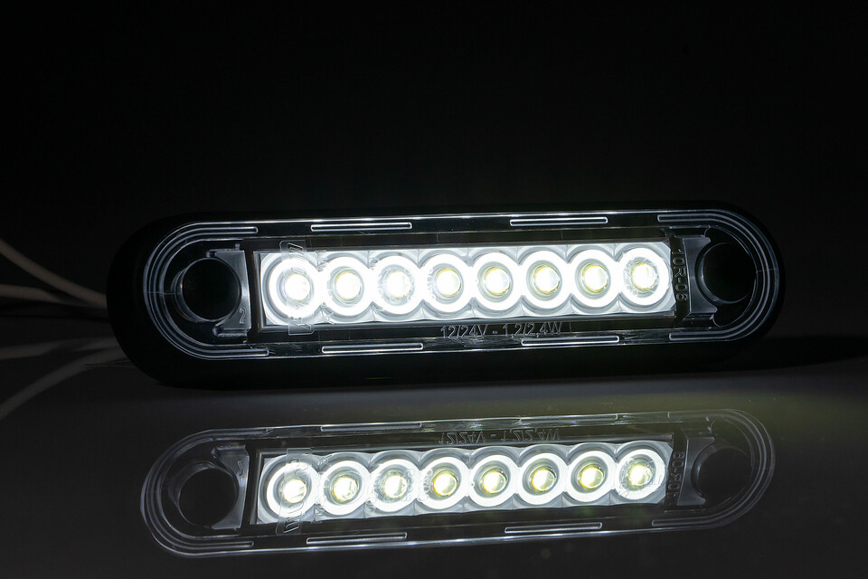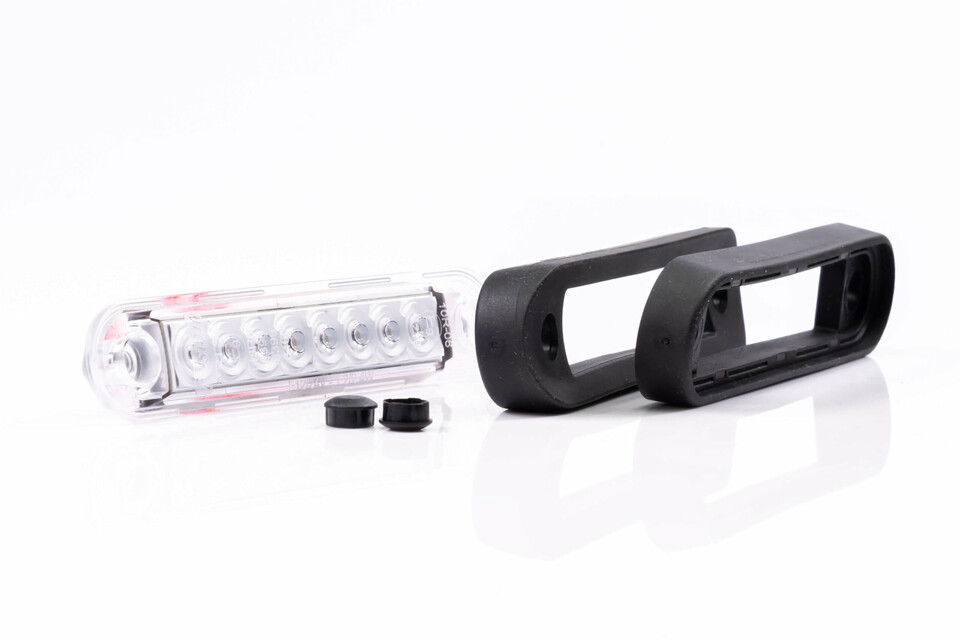 Lange LED-Begrenzungsleuchte mit transparentem Gehäuse und schwarzen Gummi-Abstandhaltern.