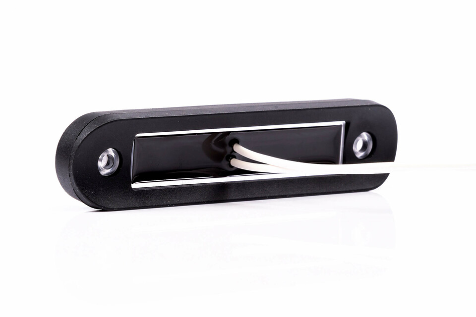 Schwarze, längliche LED-Begrenzungsleuchte mit dunklem Leuchtfeld, weißen Anschlusskabeln und silbernen Befestigungspunkten.