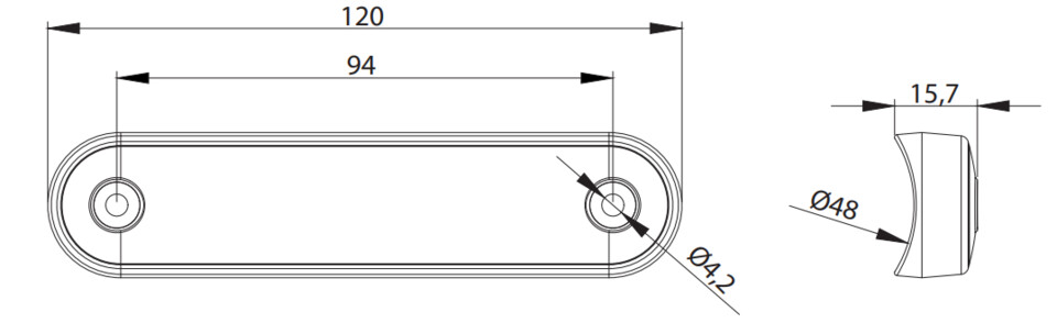 Technische Maßzeichnung einer länglichen Begrenzungsleuchte mit Befestigungslöchern und seitlichem Profil.