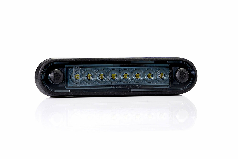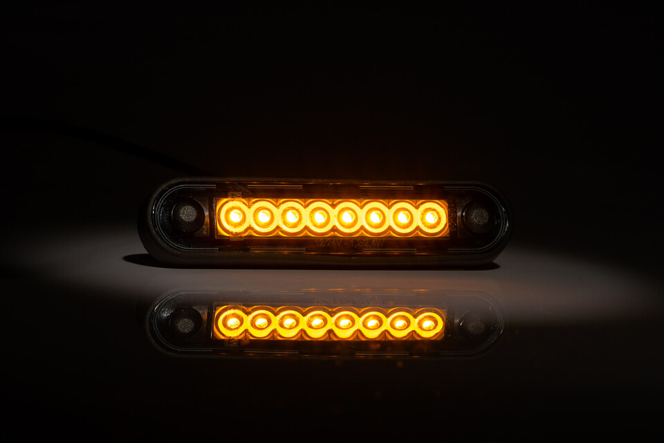 Begrenzungsleuchte LONG DARK Version mit leuchtenden, bernsteinfarbenen LEDs auf dunklem Hintergrund.