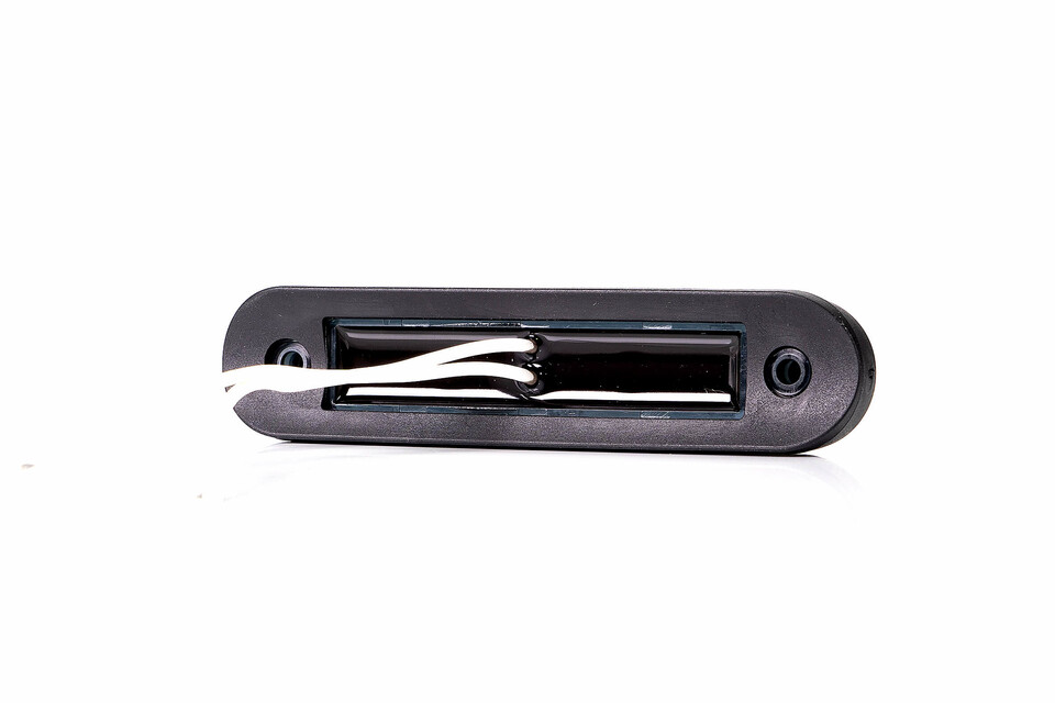 Dunkle, längliche LED-Begrenzungsleuchte mit weißen Anschlusskabeln und Befestigungslöchern auf weißem Hintergrund.