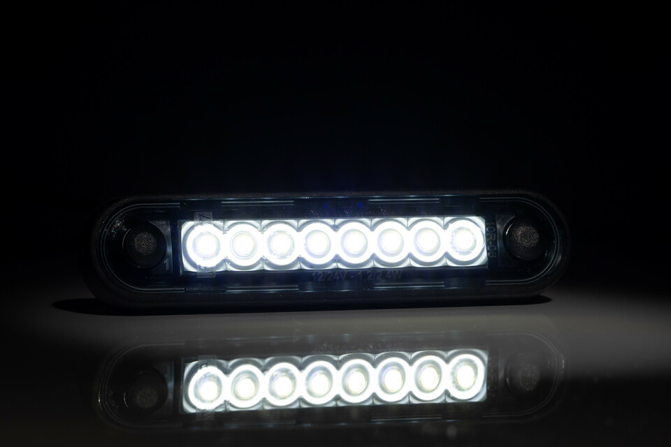 Dunkle, längliche Begrenzungsleuchte mit leuchtenden weißen LEDs und Befestigungspunkten, mit Reflexion auf dunklem Grund.