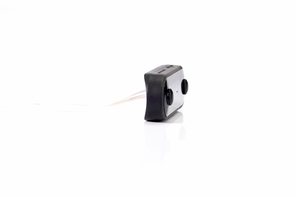Schwarze Begrenzungsleuchte (DARK Version) mit glänzender Front und Anschlusskabeln.