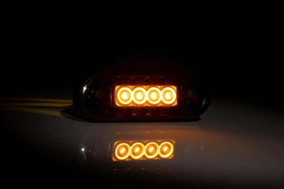 Dunkle Begrenzungsleuchte mit 4 leuchtenden, orangen LEDs und Kabeln.