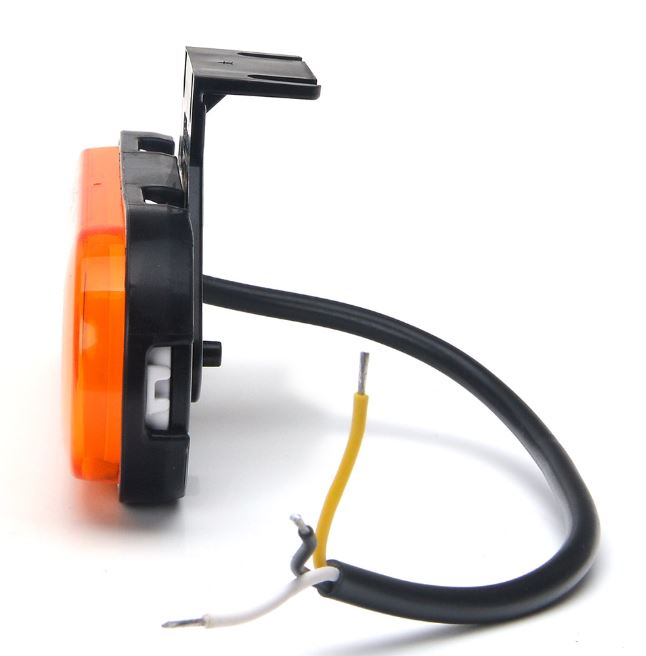 Ovale, orangefarbene Seitenmarkierungs- und Blinkleuchte mit schwarzem Halter und Anschlusskabeln.