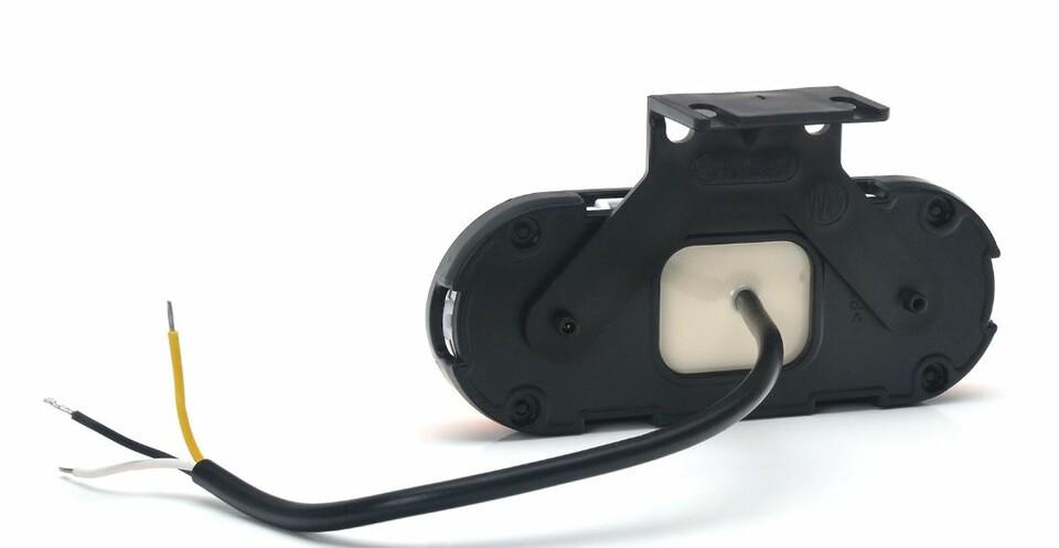 Rückseite einer ovalen Seitenmarkierungsleuchte. Schwarzes Gehäuse mit Halterung und Anschlusskabel.