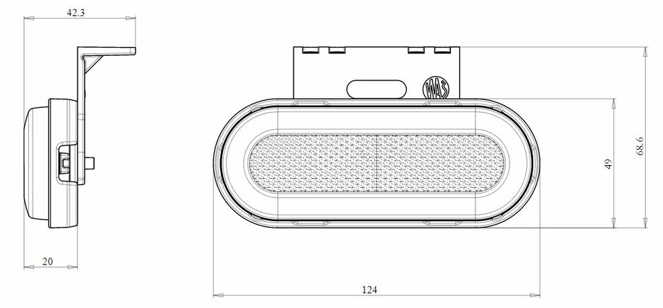 Seitenansicht einer ovalen Seitenmarkierungsleuchte als technische Schwarz-Weiß-Zeichnung.