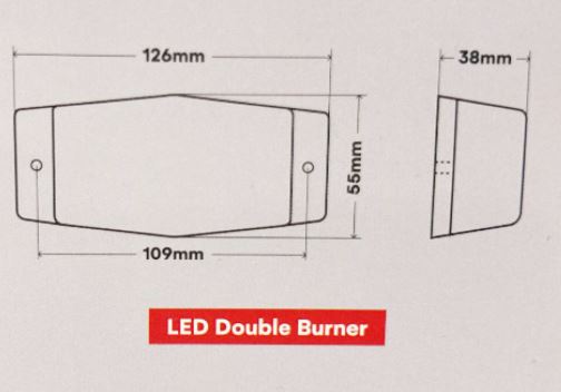 Technische Zeichnung der DTS Double Dutch LED DUAL Leuchte, beschriftet mit 'LED Double Burner'.