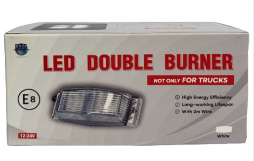 Weiße Produktverpackung für die DTS Double Dutch LED Leuchte. Zeigt die transparente LED und den Schriftzug 'LED Double Burner'.