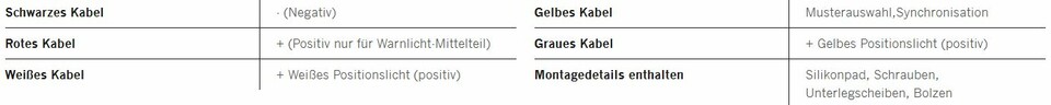 Tabelle mit Verkabelungsdetails für das Double Dutch LED DUAL & Warnlicht, inklusive Kabelfarben, Funktionen und Montagematerial.