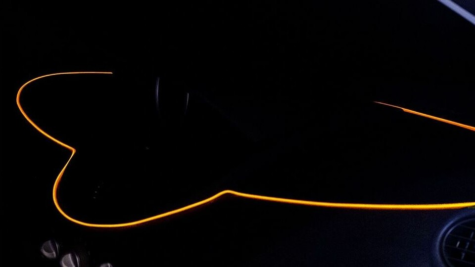 Ein flexibler, orangefarbener Ledson LED Glowstrip leuchtet dezent im dunklen Innenraum eines Fahrzeugs.