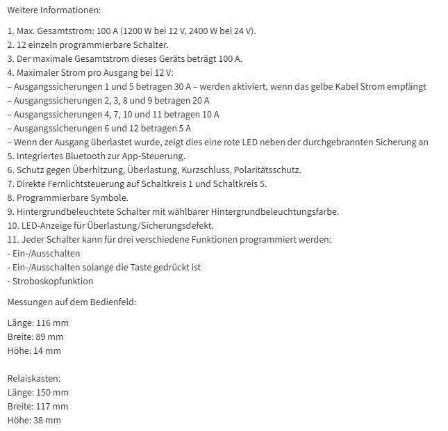 Programmierbares Bedienfeld mit 12 Einzelausgängen, steuert bis zu 12 Geräte separat oder gemeinsam. Eine Steuerung mit wählbarer RGB-Hintergrundbeleuchtung ist im Lieferumfang enthalten (mit 315 cm Kabel). Alternativ können Sie auch eine kostenlose App für Android oder Apple verwenden.