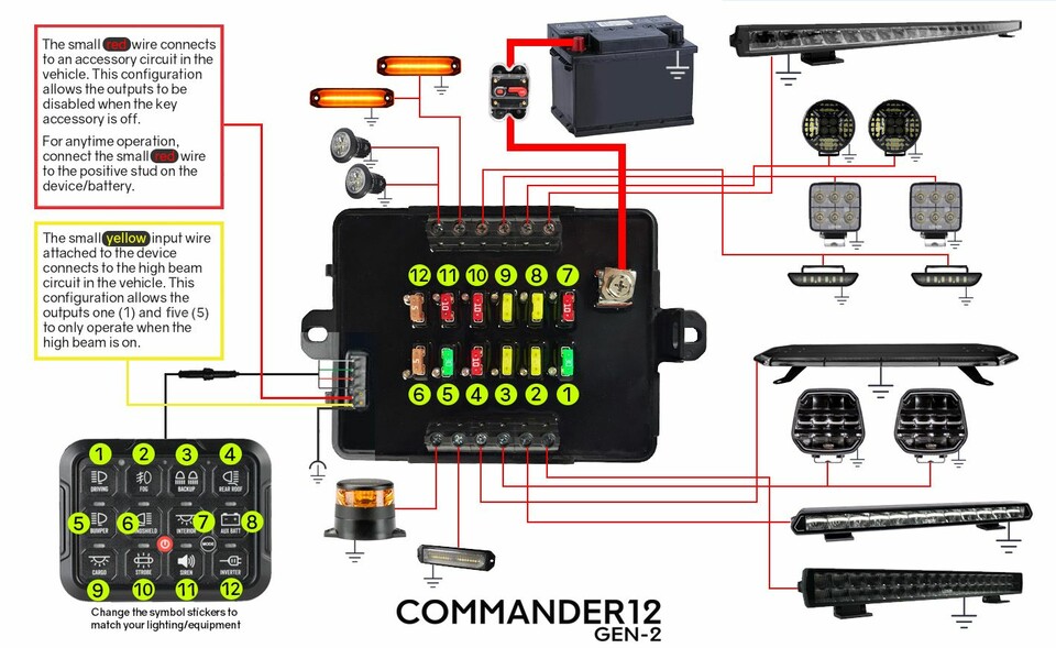Mit Commander12 Gen2 können Sie LED-Leisten, Zusatzscheinwerfer, Arbeitsscheinwerfer usw. sowie andere Geräte per Knopfdruck ein- und ausschalten! Der Commander der 2. Generation verfügt über einen Speicher , der Ihre Einstellungen auch nach dem Ausschalten der Zündung/des Fahrzeugs speichert.