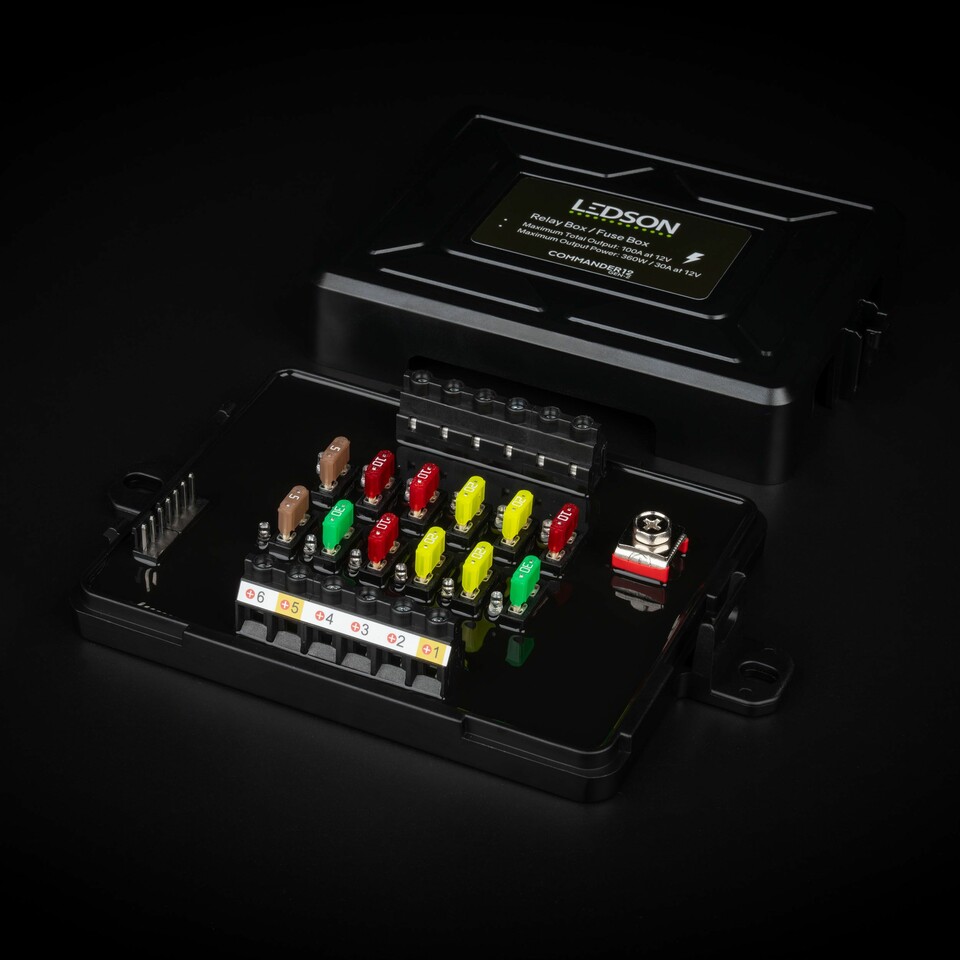 Die offene schwarze Commander12 Gen2 Relaisbox zeigt bunte Sicherungen und Anschlüsse. Aufschrift: LEDSON COMMANDER12.