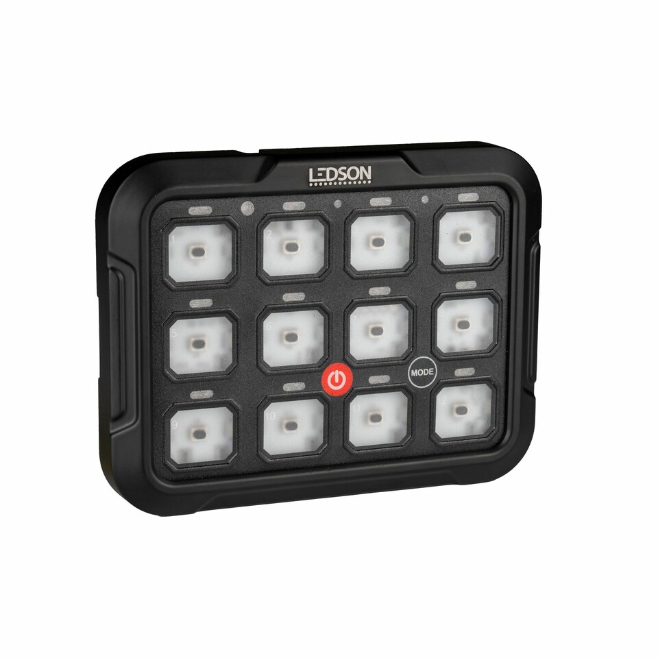 Schwarzes Commander12 Gen2 Bedienfeld mit mehreren weißen Tasten, rotem Ein/Aus-Knopf und MODE-Taste. LEDSON Logo.