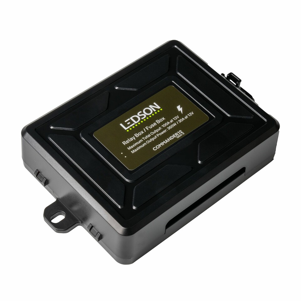 Schwarze Ledson Commander12 Gen2 Relaisbox mit grünem Produktetikett.