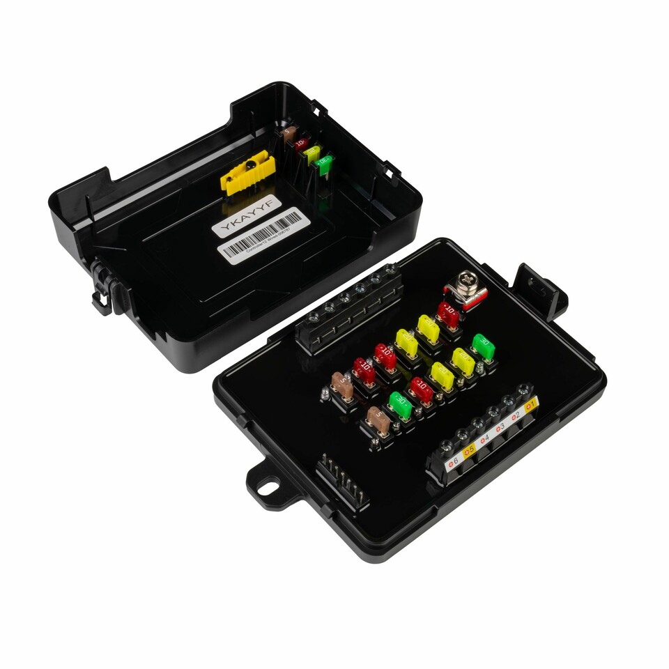 Offene schwarze Commander12 Relaisbox mit farbigen Sicherungen und Anschlüssen. Ein Sicherungszieher ist im Deckel.