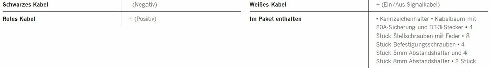 Tabelle mit Verkabelungsanleitung für schwarzes, rotes und weißes Kabel sowie Liste der im Paket enthaltenen Komponenten.