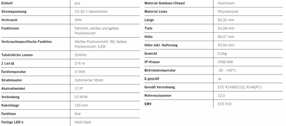 Dank ihrer kompakten Größe und Form passt die Leuchte überall hin und ist inklusive Halterung nur 93,54 mm hoch. Sie hat eine Reichweite von 276 m und eine Lichtstärke von über 2540 Lumen – eine deutliche Verbesserung gegenüber dem eingebauten Fernlicht. Sie ist E-geprüft nach ECE R149/R148.