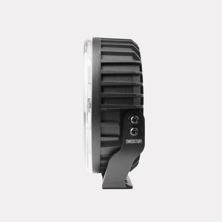 SWEDSTUFF "7" LED-Fahrlicht von der Seite, mit schwarzem Gehäuse, klarer Linse und Halterung.