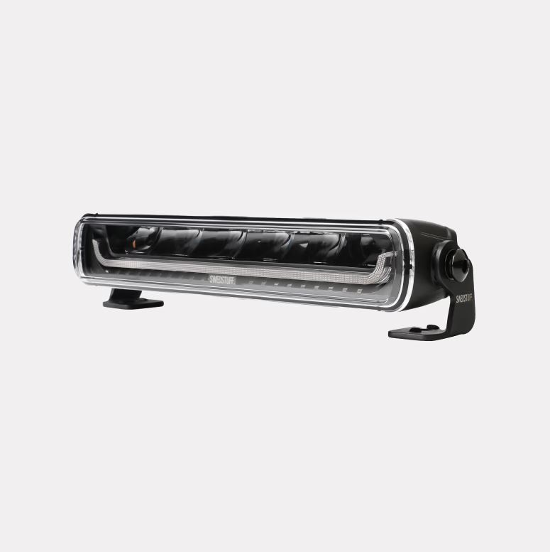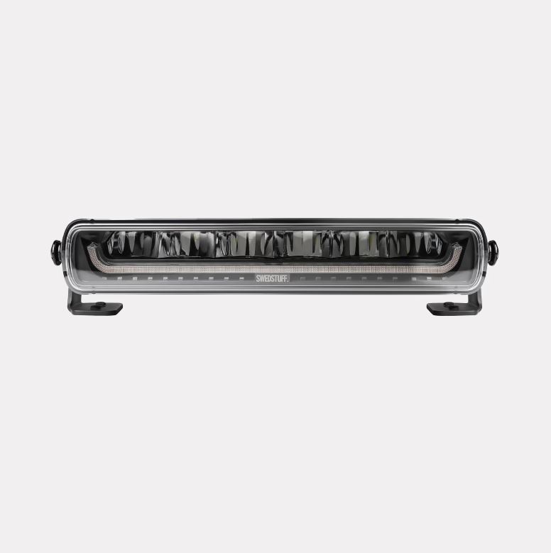 Schwarzer SWEDSTUFF 10-Zoll LED-Balken mit klarer Linse und weißem Positionslicht.