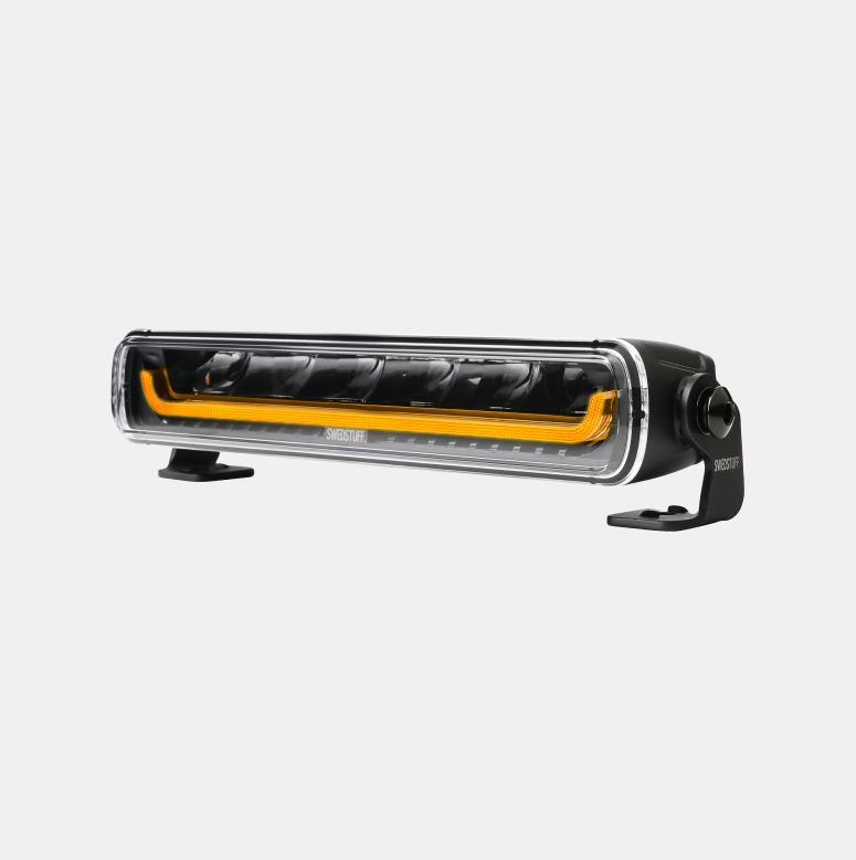 Schwarzer SWEDSTUFF LED-Lichtbalken mit klarer Linse und bernsteinfarbenem Positionslicht auf Halterungen.