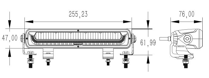 • Abmessungen: 255,23 mm x 47 mm x 76 mm (61,99 mm mit Halterung)
