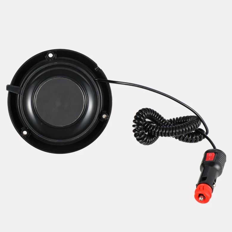 Schwarze Rundumleuchte von unten mit Magnet, Spiralkabel und Zigarettenanzünderstecker.