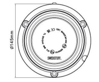 Technische Zeichnung einer runden SWEDSTUFF Rundumleuchte, Ø145mm, mit Beschriftungen.